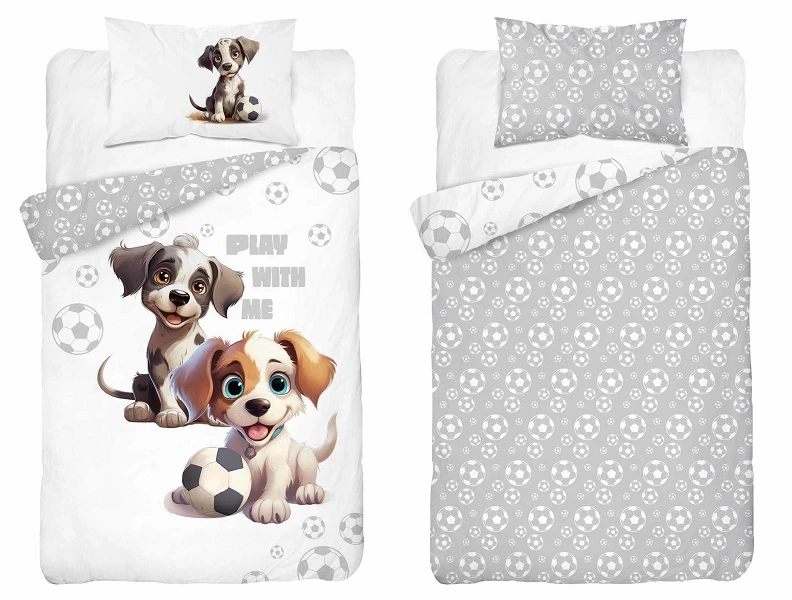 Pościel Dziecięca Bawełniana Do Łóżeczka 90x120 cm. Biała Szara Pieski Piłka Nożna 5002-B